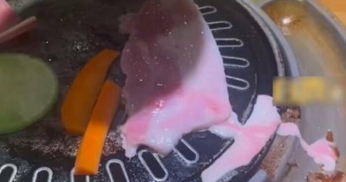 (深圳19日讯)中国深圳一名网民,近日在一间烤肉店用餐时,发现五花肉放到烤盘上后烧烤时,竟然流出诡异的粉色液体,因此质疑店家使用的是合成肉,进而向有关当局举报。