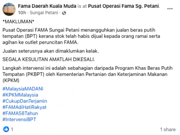 (双溪大年21日讯)继昨日数百包白米在短短1小时半内被抢空后,联邦农业销售局双溪大年分局(FAMA)原订今日再办销售活动,岂料,该局凌晨在面子书贴文取消活动,导致许多不知情民众扑空。