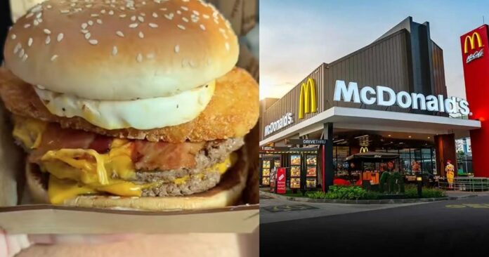 这是因为在这个时间点,麦当劳将菜单从早餐时段切换到午餐时段,因此厨房同时备有两个时段的食材。 “麦当劳早午餐汉堡” 的内馅包括两片起司汉堡肉排、培根、蛋和薯饼。