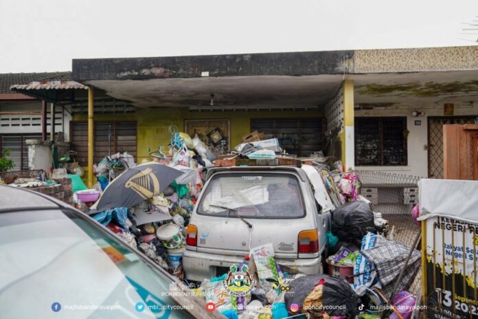 该间堆满垃圾的屋子位于怡保花园的鸽子路(Jalan Merpati),目测该屋庭院已经被垃圾堆满,形同小山坡,甚至连停在庭院的1辆第二国产灵鹿轿车都被垃圾“围堵”,车内也满是垃圾,就连家门都被淹没。