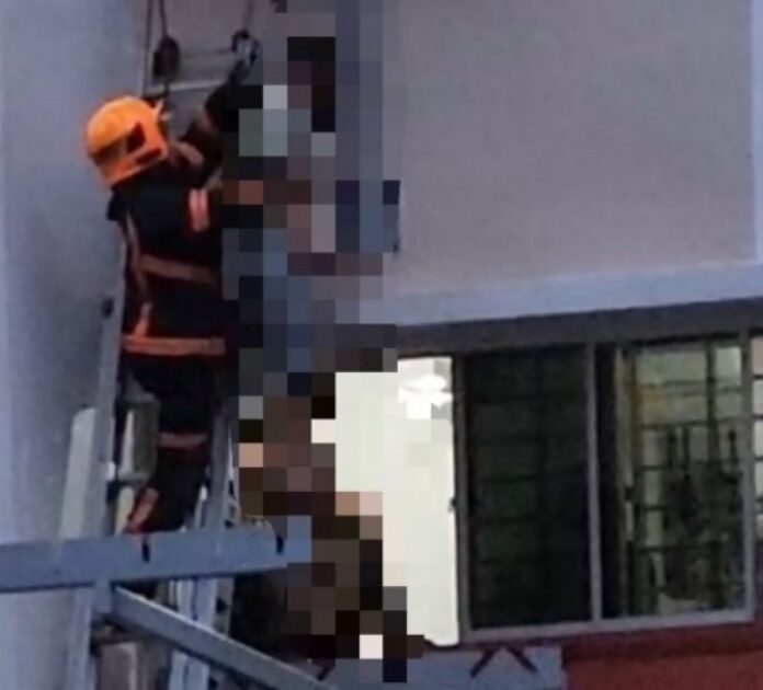 近日社群媒体流传一段影片显示,一名身穿T恤和过膝裤的女子窗外自缢,垂吊在新加坡武吉巴督一个组屋单位外的晾衣处,一名民防人员站在爬梯上试图解开绳子,另外还有几名民防人员在两个上下单位内提供支援。