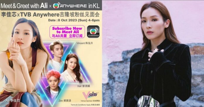 (吉隆坡29日讯)著名香港艺人Ali 李佳芯即将于2023年10月8日(星期日)来马,并携同马来西亚声梦传奇2歌手包括Vincent 陈泓升、Xair 彭诩越和Zev梁宸语一起出席由TVB Anywhere呈献的《李佳芯xTVB Anywhere吉隆坡粉丝见面会》,届时将进行粉丝见面会,感谢大家的厚爱。