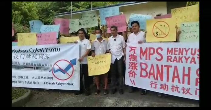 (山打根2日讯)由民兴党籍伊罗普拉区州议员张克骏服务团队发起的「以行动抗议门牌税调涨」和平请愿签名运动,今早在此间市议会办公大楼举行。共计有百名反对人士到来参加响应,以期望当局能重新考虑有关政策的计划落实。
