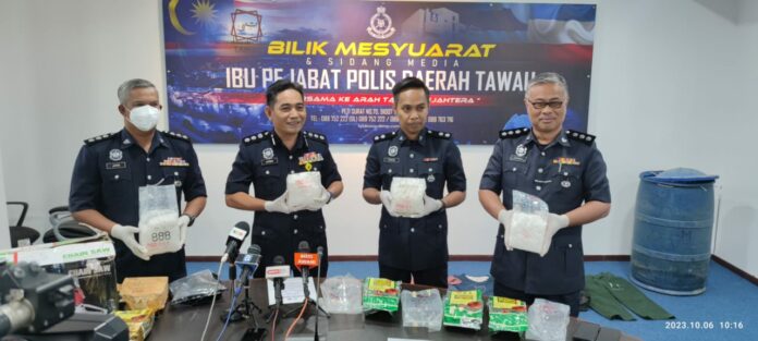 “警察发现桶内装了数件衣物及一个盒子,进一步检查盒子发现内里有三个绿色写有观音王的胶袋,有一个金色同样是观音王的胶袋,胶袋内是晶状疑是沙布的物品重量达4091.88克,市场价值24万令吉。”他说。