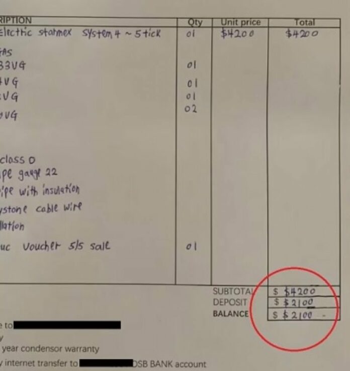 事主跟该技工联系后,也选了一个4200新元(约1万4497令吉34仙)的冷气配套,付了一半定金,也就是2100新元(约7248令吉67仙)。