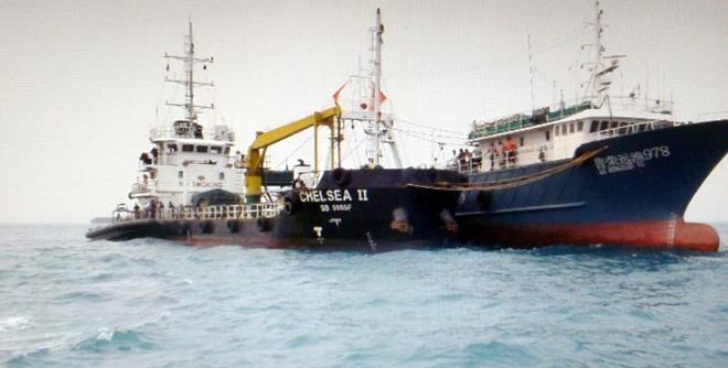 「执法人员发现,名为『MT Chelsea II』的油槽船,正將45吨543公斤的轻柴油(MGO,適用于高速柴油机),输送至名为『MV 鲁荣远渔 978』的油槽船。」
