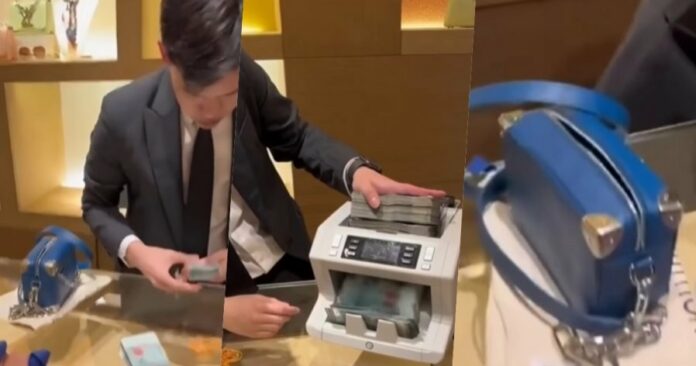 (吉隆坡17日讯)社交媒体日前流出一段视频,画面可见一名妇女在一家知名品牌的商店,直接用一叠叠的50令吉现金,买下总值上万令吉的名牌包包。