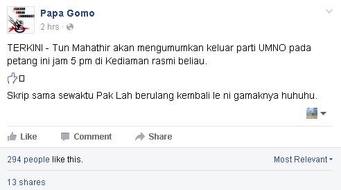 Papagomo今日下午2时10分左右在面子书贴文指出,敦马哈迪將于下午5时,在住家宣佈退出巫统。