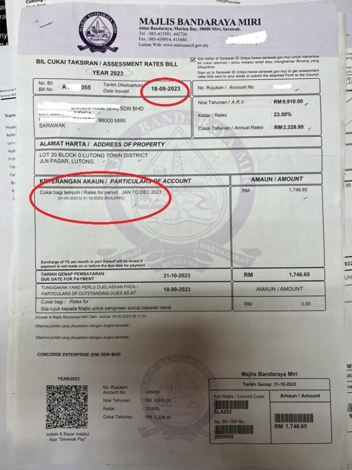 (美里22日讯)已缴清今年全年的门牌税,市政局继续在今年9月18日发出另一张列明征收更高税务的催税单,即是说业主在一年内总共收到市政局发出3张门牌税的催税单。