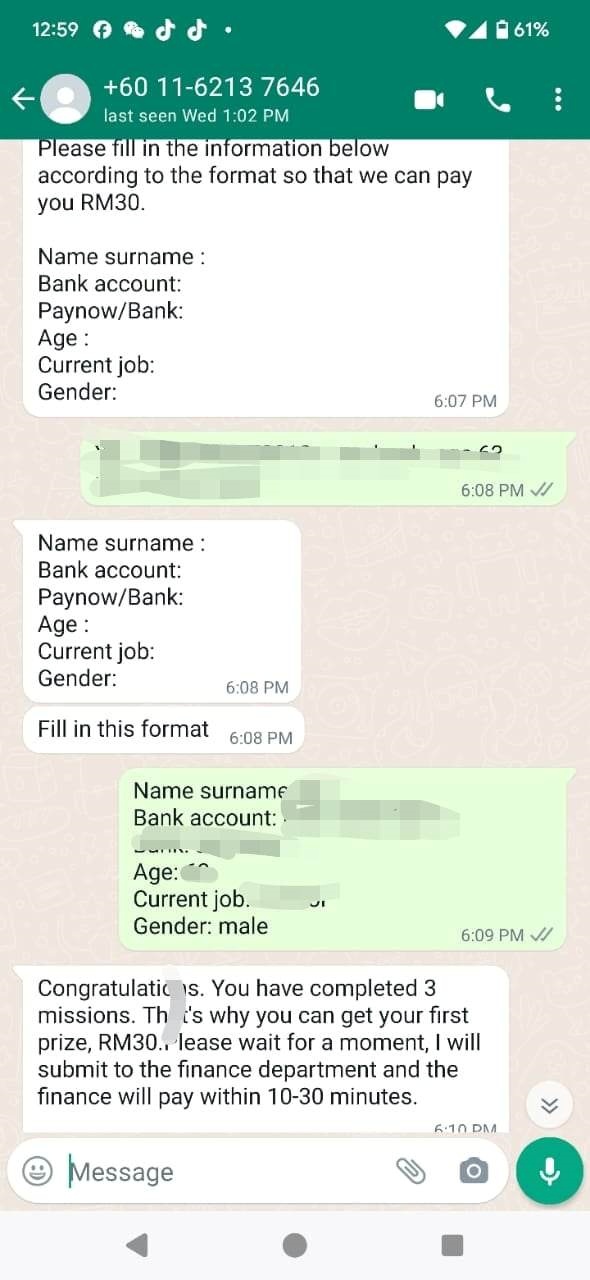 该名男子是退休人士,于日前收到对方一条whatsapp短讯,表示经理看了他的资料,觉得有适合他的任务可以让他赚钱。