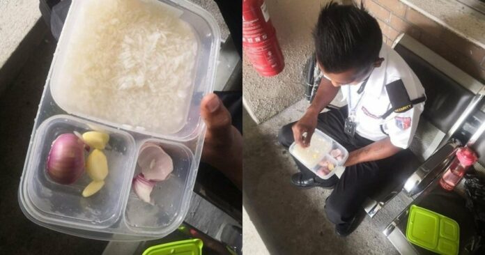 根据该网民的分享的照片,这名外籍保安的饭盒内,只有泡著白开水的白饭和一颗生洋葱及两三办的生蒜头,看者心酸。