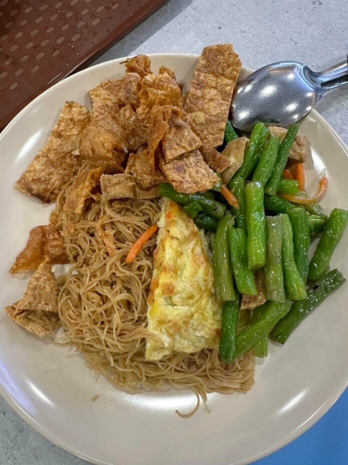 据记者观察,摊位也售卖不同种类的优惠套餐,例如两菜一素肉的饭套餐,以及一蛋一素肉的米粉套餐,只需要3.50新元。
