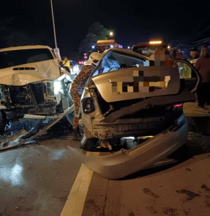 这起夺命车祸昨晚约7时,在兵南邦绕道路Padimas Ponit的U转路口发生。涉祸交通工具分别是一辆国产赛佳和丰田四驱货卡。