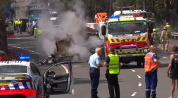 (悉尼29日讯)澳洲新南威尔斯州高速公路,靠近白山的M1路段,今早发生两辆运载芥花油和柴油的同方向行驶的罗里追尾相撞,引发大火的事故,两名罗里司机从火海中,及时逃出生天。
