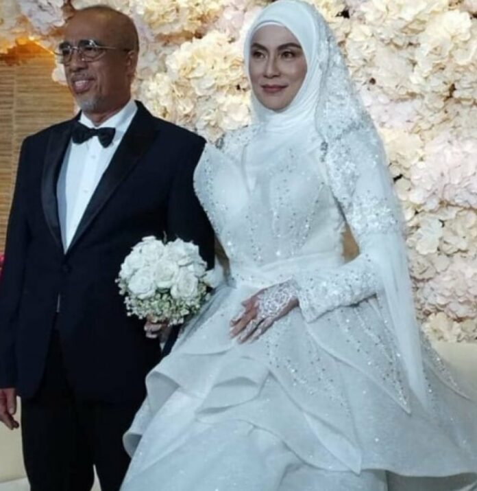 56岁大马华裔女演员陈意遐(Angeline Tan)日前与62岁马来导演Sabri Yunus举办婚礼晚宴,陈意遐穿上由时装设计师阿纳斯阿都拉所设计的白色婚纱,成为全场焦点。她也透露,这豪华白色婚纱取名“百合”,寓意“百年好合”。