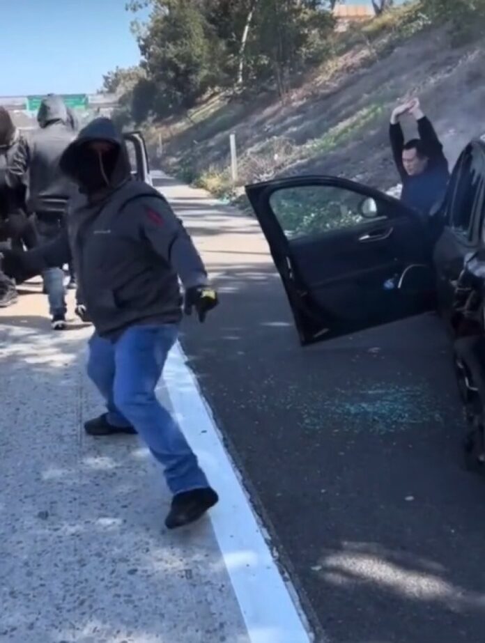 (洛杉矶8日讯)美国南加州早前发生一宗劫案。4名劫匪驾车从后方故意冲撞目标车辆,继而上前抢走车内财物。有传车上珠宝商来自香港,当时其举高双手跪地。整个抢劫过程犹如电影一样,有网民更将影片上传网络。
