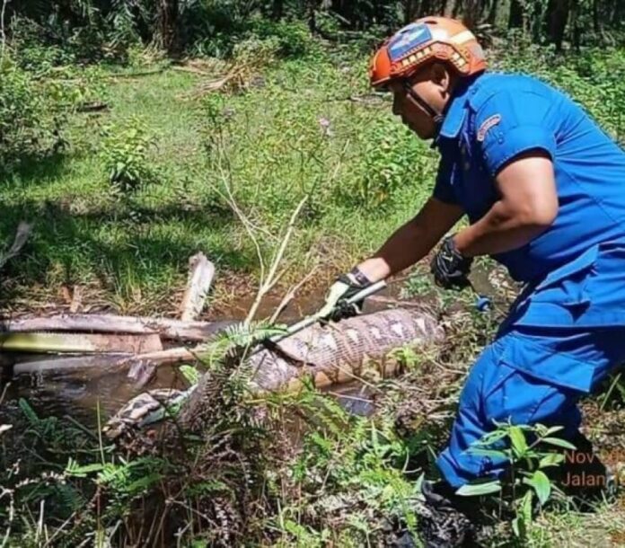 阿罗邦苏甘榜士雷阁油棕园的员工,是于本月7日(周二),在油棕园的小河道发现该条重量超过50公斤的大蟒蛇。