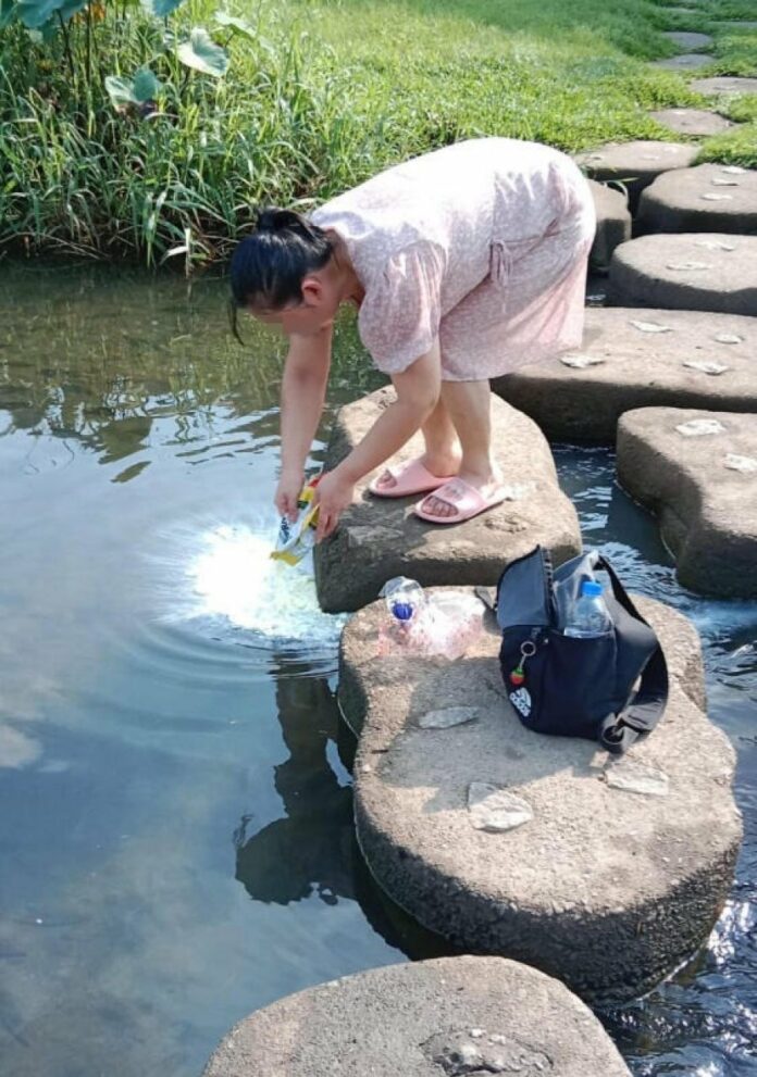 (新加坡15日讯)女子被指将过期奶粉倒入碧山公园池塘,违规投喂鱼虾,行径被路过民众拍下举报。