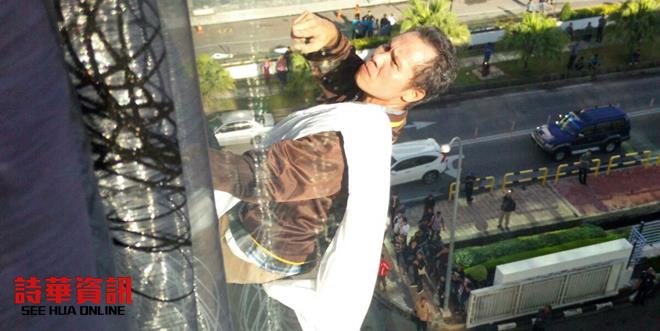 (本报亚庇5日讯)一名疑面对家题问题与生活压力的菲律宾籍男子,今凌晨时分入住加拉文星一家酒店的客房,清晨时分竟从五楼客房的窗口,攀爬至五楼横梁,两腿悬空骑坐在横梁,高声叫骂恫言欲跳楼。