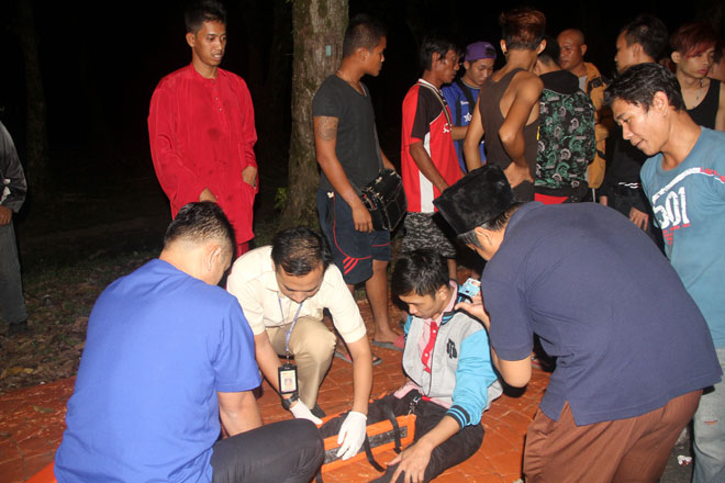 砂拉越南砂 摩托迎撞车子 骑士挂彩 2015年11月6日 医护人员抵达现场为伤者施援。 (本报古晋5日讯)摩托车迎撞车子,骑士挂彩由抵达车祸现场的救护车送抵急诊部求医。Advertisement 该宗意外事于昨晚11时左右,发生在跑马场路的婆罗岸政中不远路段,受伤的摩托车骑士查悉为23岁的友族。 事发当时,骑士是骑着摩托车从三小方向朝向南市市政局方向前进,肇祸的车子则是朝向三小方向驶来。 在抵达该路段时,摩托车和车子发生了碰撞,摩托车和车子均告损毁,骑士则投诉脚步疼痛。 古晋中央医院急诊部在接到通知后,马上安排救护车到现场施援,将伤者送抵急诊部疗伤。