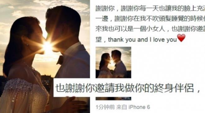 虽然会场里面忙招呼朋友,但杏儿半夜也將自己和未来老公的婚纱照放上微博,她与老公Philip情深对望,並留言道:「谢谢你,谢谢你每一天也让我的脸上充满笑容,谢谢你在过马路的时候永远站在有车的那一边,谢谢你在我不吹头髮睡觉的时候你会一路骂我一边帮我吹乾,谢谢你,让我知道原来我也可以是一个小女人,也谢谢你邀请我做你的终身伴侣,让我对未来充满信心和希望,thank you and I love you」