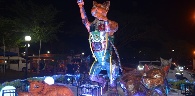 砂拉越南砂 古晋新地标 守护猫亮灯 2015年11月13日 古晋守护猫。 (本报古晋12日讯)配合世界糖尿病日,古晋北市市政局于昨日为河滨公园的古晋守护猫亮起蓝灯,成为古晋新地标。Advertisement 出席者包括北市市政局总监莎迪雅、市政局委员拿督黄鸿圣、大马糖尿病协会砂分会主席温友发等人。 古晋守护猫是由钢铁猫被4只小猫围绕组成,钢铁猫象征“守护”,代表古晋北市政局守护着古晋市的安宁,也是该市政局与玛拉工艺大学携手合作,花了将近4个月才完成的项目。