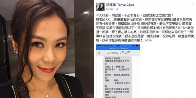 蔡健雅这回推出的专辑预购礼,儘管需要多加60台幣(约8令吉),但內容物包含亲笔签名、照片册与海报,不少粉丝都认为有诚意,可却有一名粉丝私讯她,强调「亲笔签名?我没有也不要」、「照片册?我买光碟不是要这个」、「海报?嘖嘖」態度相当不友善,更呛「不要把消费者当笨蛋,请问好康在哪里?」並称自己寧愿吃饱一点,也说「不会再支持了。」