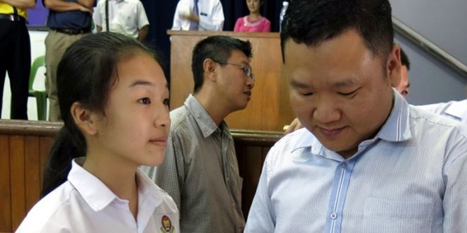 (双溪大年17日讯)以优秀的成绩报答患癌的母亲,双溪大年老街场华小本年度女模范生詹苡莛,在今日放榜的小六检定考试中考获7A的佳绩,让患癌的母亲何莉菁欣慰不己。