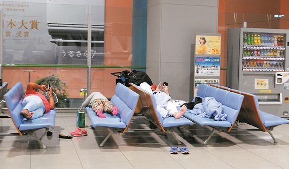 综合报导,关西国际机场深夜、凌晨时货运航班的起降数量是最多的。当局表示,廉价航空航班常在深夜抵达和清晨出发,隨著廉航航班持续增加,在关西机场第一航站楼留宿的旅客也大大增加。这些旅客常把2张4人座的长椅合併当作「睡床」,且使用后也不將长椅復归,地板也因为常移动长椅,造成非常多的刮痕。