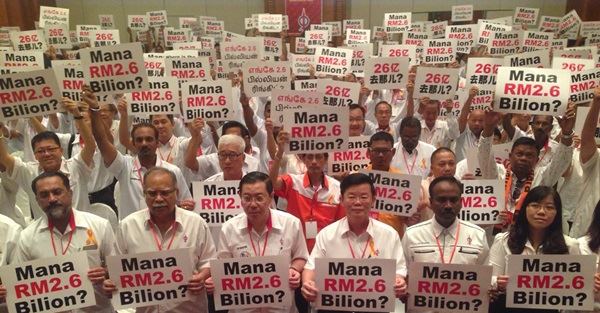 西马 行动党眾领袖高举「26亿令吉在哪里?」大字报 隔空呛纳吉 2015年11月29日 檳州行动党於週日早上在贵都酒店举行党员代表大会,由於今年適逢改选年,大会会场近乎座无虚席。Advertisement 图见大会开始前夕,一眾党领袖如林冠英(左3起)、曹观友等人与全场党代表齐齐高举“26亿令吉在哪里?”纸卡,向首相拿督斯里纳吉呛声。