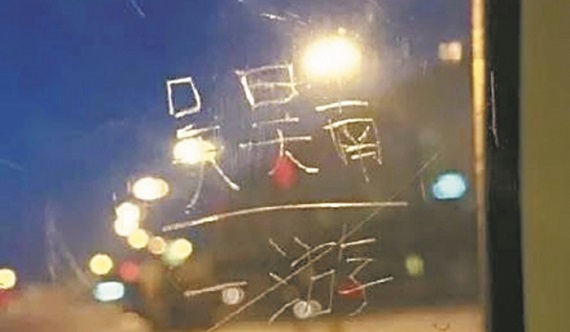 (北京2日讯)中国许多游客喜欢在景点刻字留念,遭詬病许久。日前有网民发现,一架上海飞往瀋阳的飞机舷窗上也遭人刻字,除了「吴昊南一游」外,还有英文、俄文。