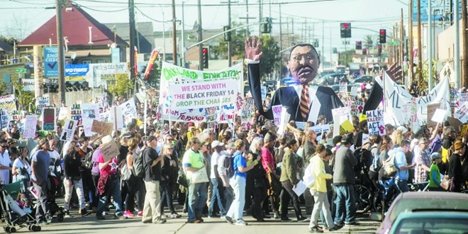 自上午起,有上千人在奥克兰市中心和地铁站集会,呼吁司法公正和平等权利。他们从市中心百老匯大街出发,沿著14街、国际大道等往南行至水谷果地铁站,最后再汇集体育场站。