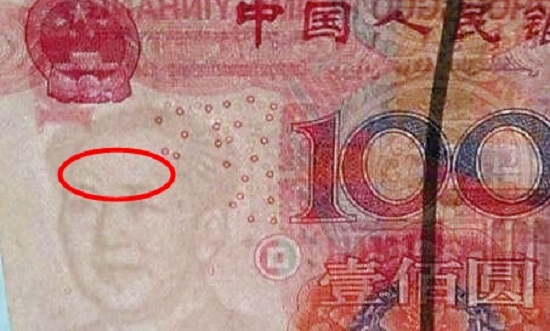 《齐鲁晚报》报导,山东东营市一名李姓男子,一周前从银行提款时,从柜檯换来一张新版百元人民幣钞票,回家一看发现毛泽东水印头上多了一道眉毛。