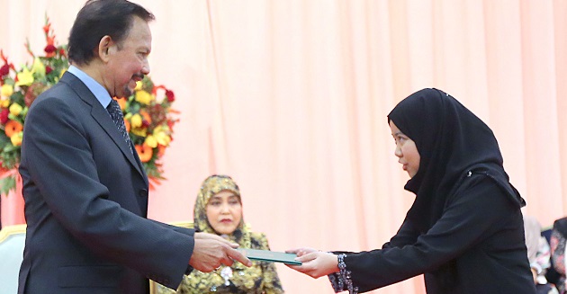 陛下昨天恩准向两名人士颁发了“汶莱大学名誉校长学者”奖学金。该两人将在国际驰名院校攻读博士学位课程。对两位奖学金得主,陛下希望他们继续聚焦于学习目标上,保存汶莱人的身份特征,同时证明他们有能力在各自的领域取得成功。