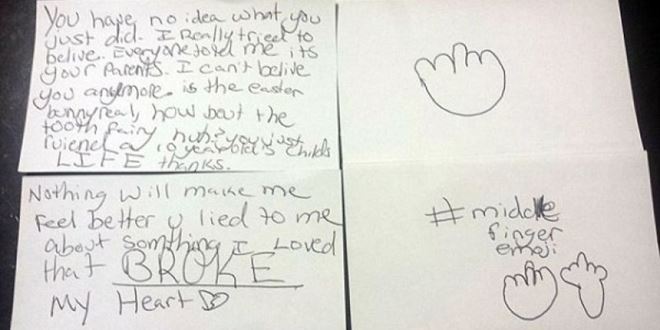 小女孩贝莉(Belle)在信中生气地说「你们根本不知道你们做了什么,每个人都跟我说圣诞老人其实就是我的父母,但我还是真心的相信耶诞老人存在」、「我没办法再相信你们了,复活节兔是真的吗?那牙仙子呢?你已经毁掉了一个10岁小孩的生活了,谢谢。」最后更写道「心碎了」,甚至画了中指的图案以表愤怒。