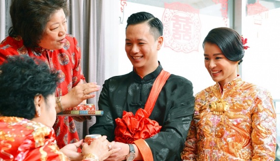 结束后,大伙儿应记者要求影合照,身穿裙褂、戴满金器的杏儿更与老公亲嘴拍照,后又登上座驾移师尖沙咀丽思卡尔顿酒店(TheRitz-Carlton)。原来男家於酒店租了一间大套房,两人再向男方的父母、长辈奉茶!