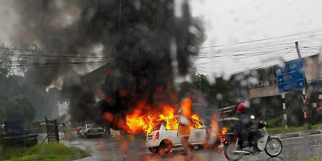 砂拉越南砂 金龙鱼轿车突冒火烧毁 2015年12月29日 轿车失火后狂烧,黑烟滚滚升空。 (本报古晋28日讯)一辆行驶中的国产金龙鱼轿车,于今天中午大雨中在朋尼逊路4哩突冒火烧毁。Advertisement 消防拯救局接获公众的投报后,即派出救火车与消防员赶往现场将烈火扑灭。虽然如此,该轿车之焚燬程度达80%。 峇都林当消防拯救局有于今午11时56分接获投报后,即派出一支消防队与一辆救火车驰往现场投入灭火行动,并很快的于中午12时半就将火扑灭。 有关行驶中的轿车突冒火燃烧之原因,有待当局进一步调查。