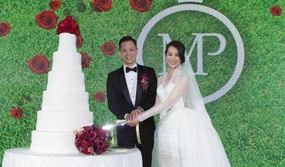 隨后一对新人在台上切结婚蛋糕,並合巹交杯,接受一眾亲友祝贺。