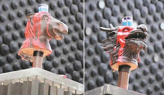(台北31日讯)台北故宫南院前天开幕试营运,成龙赠送十二生肖兽首公共艺术给故宫。但有媒体报导是统战,30日下午5时有一男一女突然朝龙和马兽首上倒红漆,被人发现报警,目前警方已將两人带回嘉义县太保分驻所侦讯中。
