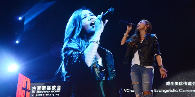 昨晚她献唱的歌曲包括有《小尘埃》,歌词表达的就是她追寻梦想的高起迭起,很像她以前的想法,认为自己是一个小尘埃,没才华,后来经历神的爱有很大的转变;之后她也呈献了著名歌曲《只怕想家》。
