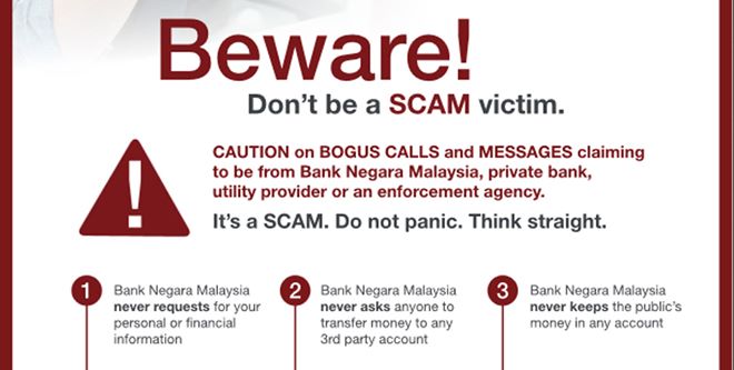 有鉴于此﹐国家银行提醒民众保护自己﹐切勿回应任何声称来自国家银行﹐要求参与投资计划或可疑诈骗活动的电话﹑简讯或电邮﹐并提防一些公司或个人利用据称由国家银行发出的认可书来索取钱财或要求投资﹐因为国家银行是不会联络民众﹐以介绍任何投资计划﹐或是要求提供个人银行资料或进行资金转帐的。