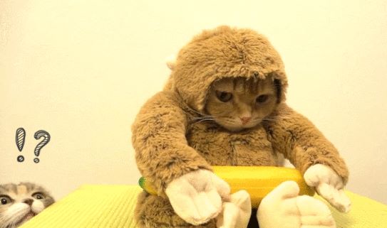 视频中,一只姜黄色小猫正坐在堆满水果的桌子上,津津有味地舔着主人递过来的香蕉,更奇怪的是,它竟穿着小孩子表演节目才会穿的猴子戏服,仅露出了脸部,表情呆滞,不言不语,似乎情绪低落。