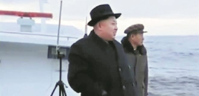 综合报导,在朝鲜中央广播电台播放的新纪录片,身穿冬季大衣、头戴软呢帽的金正恩,登上军舰视察潜艇发射弹道导弹弹射测试。