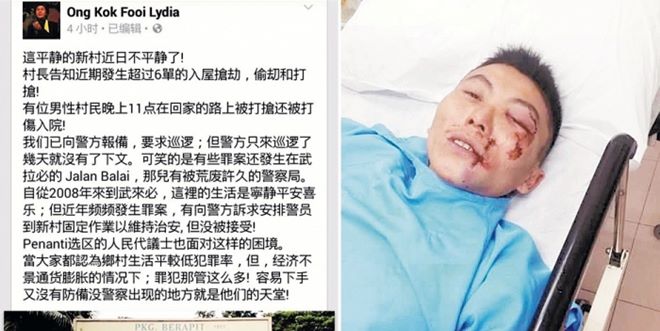 (大山脚9日讯)武拉必新村治案亮红灯,一个月內传5宗劫案,村民被掠夺致伤、多间民宅被持械匪徒入屋偷窃,武拉必区州议员王国慧向执法单位求救不得要领,有感「呼天天不应,呼地地不灵」的感觉,在「无计可施之下」下只好在面子书上大吐苦水。
