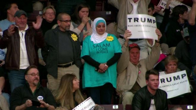 (哥伦比亚10日讯)美国一名穆斯林女子到总统参选人川普的造势场,静默站立抗议其言论,但却遭川普支持者轰出场,还被指身有炸弹,穆斯林倡议团体强烈谴责,要求川普道歉。