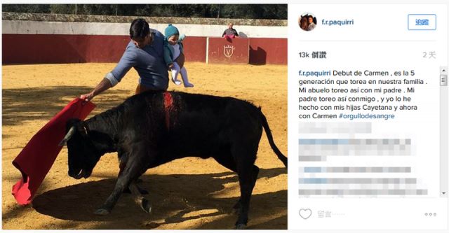 根据英国《卫报》报导,斗牛士瑞维拉(Francisco Rivera Ordóñez)近日在自己的Instagram上张贴他一手抱着女婴、一手斗牛的照片,贴文标示:「卡门(Carmen)初登场」。该影像一上传,马上招来海内外的广大用户批评,就连动物保护团体、儿童保护团体均为这名糊涂父亲的行为感到愤怒。