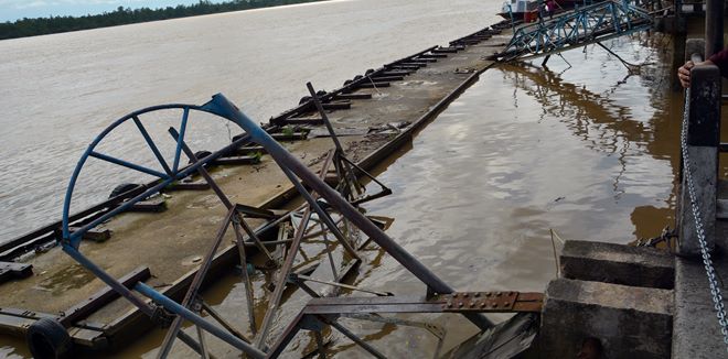 诗巫大伯公庙处的浮箱衔接码头之4个木板桥于去年11月16日遭撞毁。调查报告指出,肇祸驳船因为击着的船绳松脱,船身随水流撞及并撞坏了木板桥。