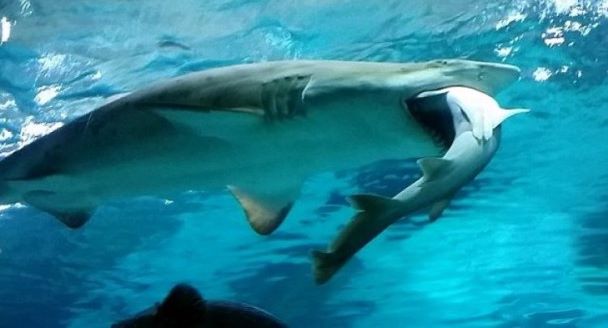 2.2公尺长的母鲨鱼,在水族箱里慢慢游着,嘴里咬着一只公鲨,正在一口一口地把它吞下肚,公鲨的头已经看不见了,剩下一条长长尾巴挂在母鲨的嘴旁,动也不动。虽然小鲨鱼打架时有所闻,但在韩国首尔这家水族馆,鲨吃鲨的意外,还真是第一次发生。
