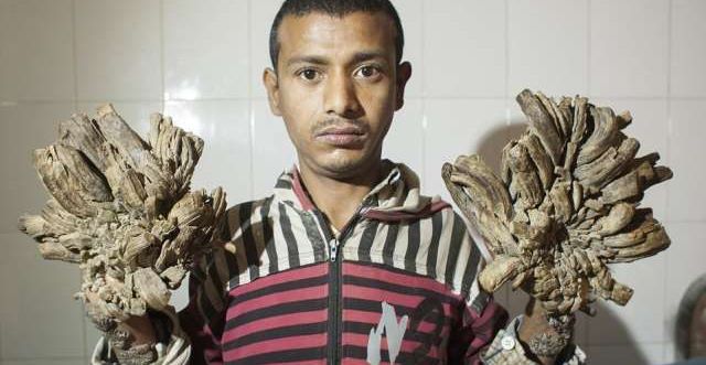 25岁的阿布尔(Abul Bajandar)自7年前罹患「疣状表皮发育异常」(Epidermodysplasia Verruciformis,EV)后,他的手脚就开始增生如树根般的疣块。达卡医院(DMCH)的烧伤整形外科权威医师萨曼达(Samanta Lal Sen)表示,他们会先评估阿布尔的病症后,再决定如何医治。