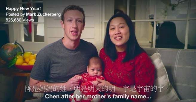 面子书创办人马克扎克伯格(Mark Zuckerberg)在除夕(7日)当天,上传一段影片到其面子书专页。影片中扎克伯格与他的美籍华裔妻子普莉希拉・陈(Priscilla Chan)和新生女儿Maxima一起,用中文向大家拜年。